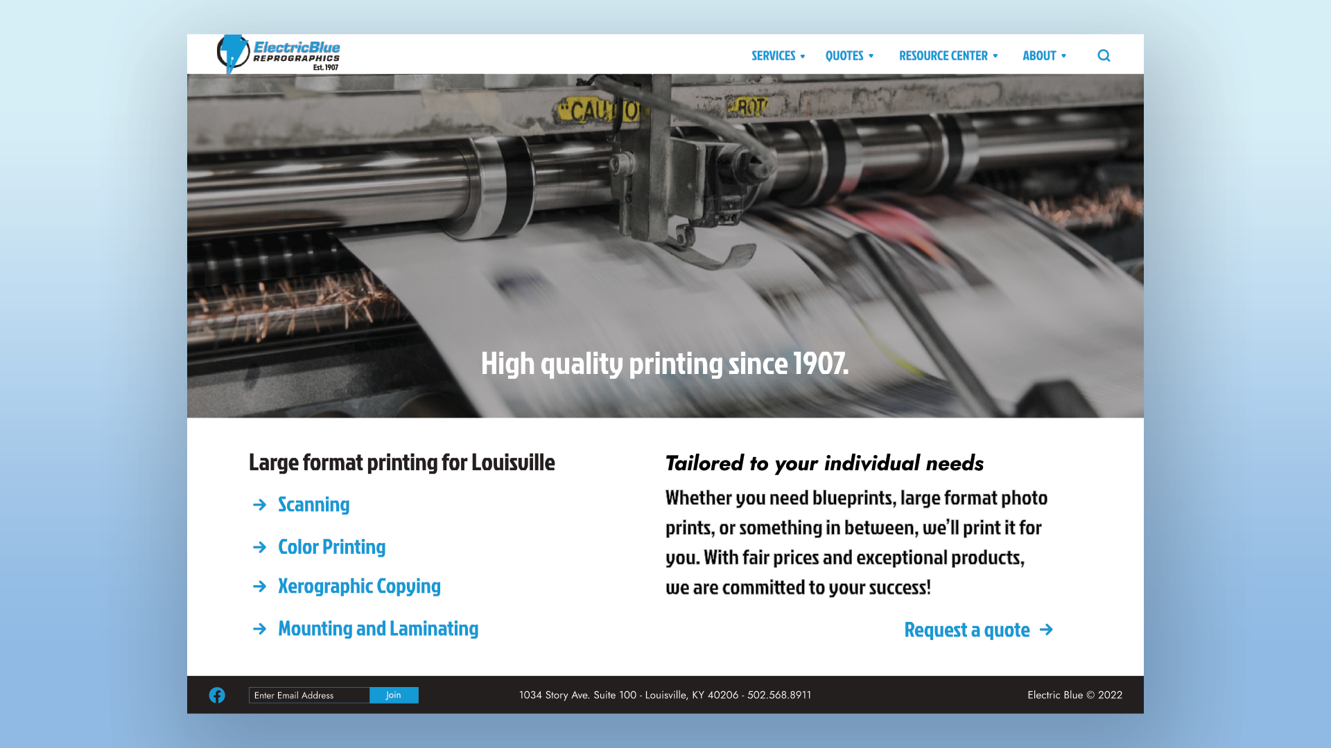 Feeling like a lot was missing on their website, I created a new design that is easier to navigate and better displays the company’s capabilities. Using Figma, I designed a new landing page, a services page, and a quote form. This new design would allow potential customers to more easily get pricing, learn about the types of printing Electric Blue offers, and have a clearer mental image of the company itself.
