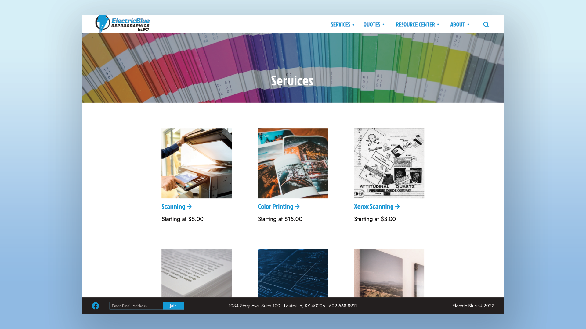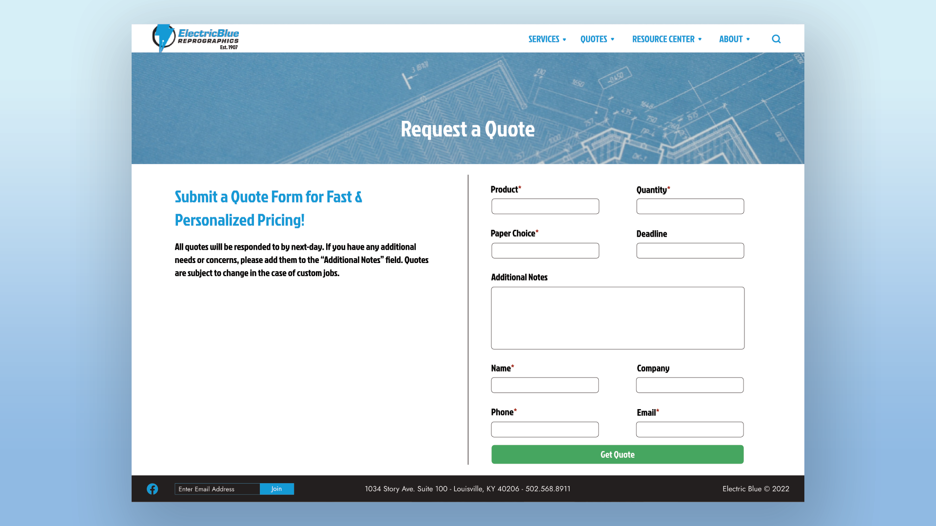 The current website for Electric Blue Repographics, created in 2013, is quite outdated. It’s difficult to navigate, doesn’t provide any examples of their work, and lacks any intuitive user flow besides the menu bar. Their current website also lacks a quote page entirely, leaving customers with no way to get pricing without emailing or calling the shop.